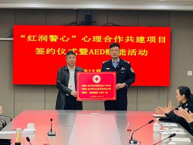 为健全基层社会治理体系、守护民辅警身心健康、筑牢公共安全防护网,12月11日下午,海陵区红十字会与公安海陵分局联合举行“红润警心”心理合作共建项目签约仪式暨AED赋能活动。泰州市红十字会党组书记、常务副会长张纯,海陵区红十字会党组书记、常务副会长马加清,公安海陵分局党委委员、政工室主任宋祥等领导出席活动,城东派出所民辅警代表共30余人参与。